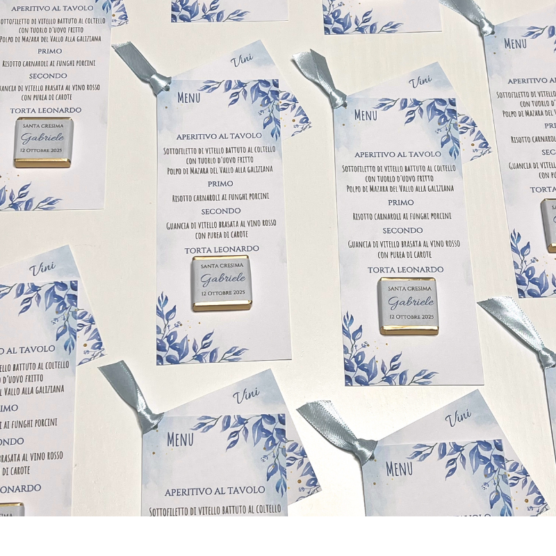 Segnaposto composto da Menu, cioccolatino e carta dei vini in coordinato. Un tocco di classe per una tavola curata e armoniosa.