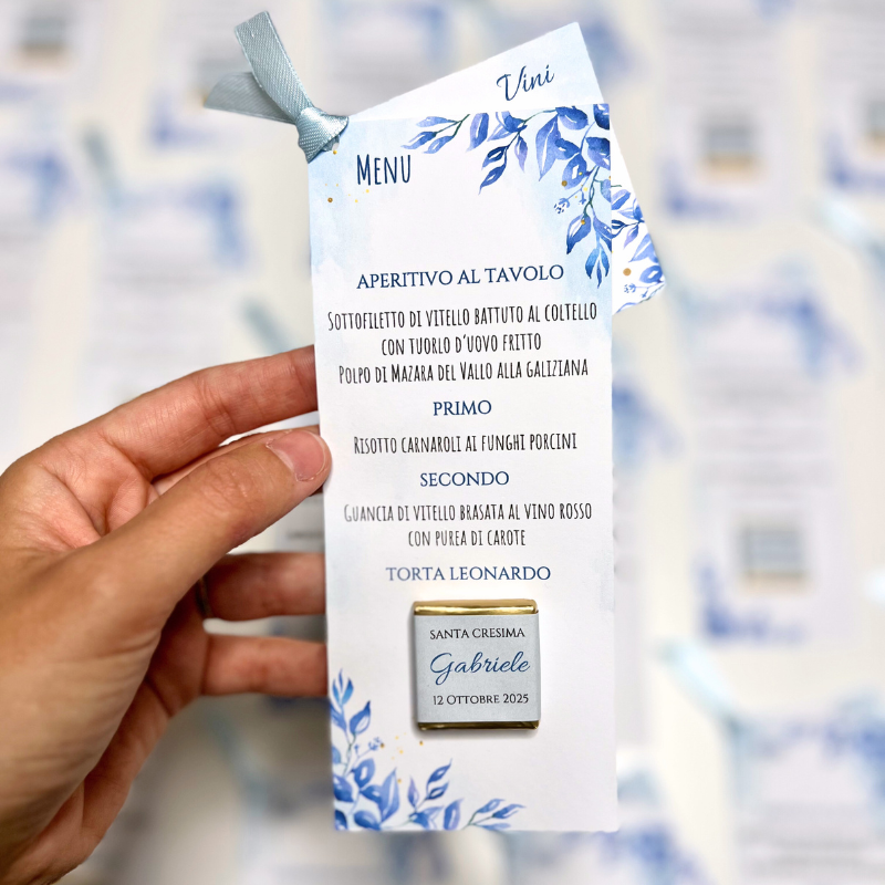 Contiene 1 cioccolatino  – Misure card Menu: cm 14 x 7 e Card Vini 7 x 7